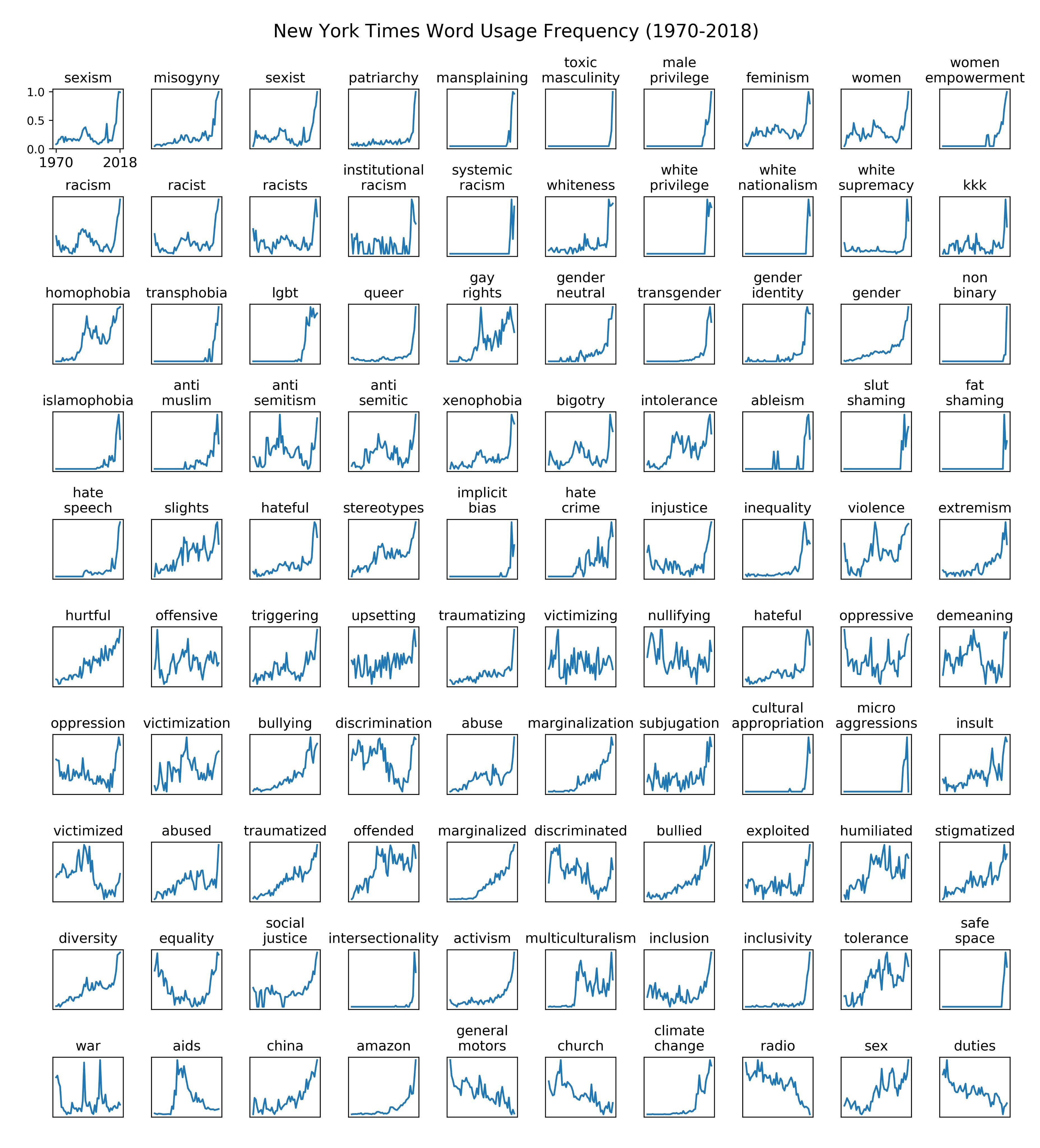The above chart comes from David Rozado, who in this tweet from 2019 showed a sudden step change in the use of many different words associated with wokeness. This just confirmed what most people already intuited, but seeing it plotted was arresting: