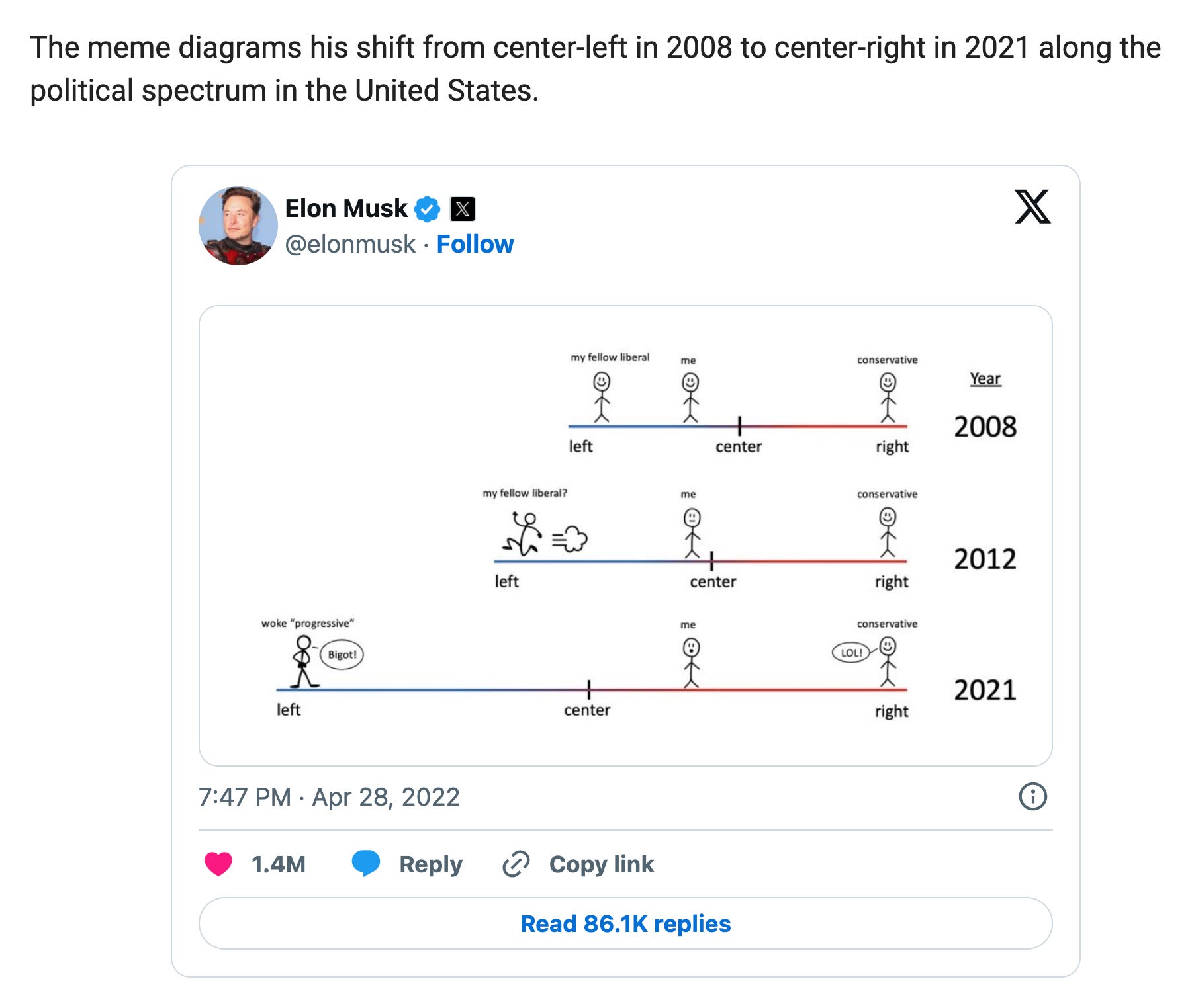 Elon Musk is an excellent example of this. He is hated by the left because he went from a highly influential progressive environmentalist to someone who injects a constant stream of memetic skepticism into the Twitter feeds of hundreds of millions of people. And why did that happen? Because he felt exhausted by the left’s constant cause switching:
