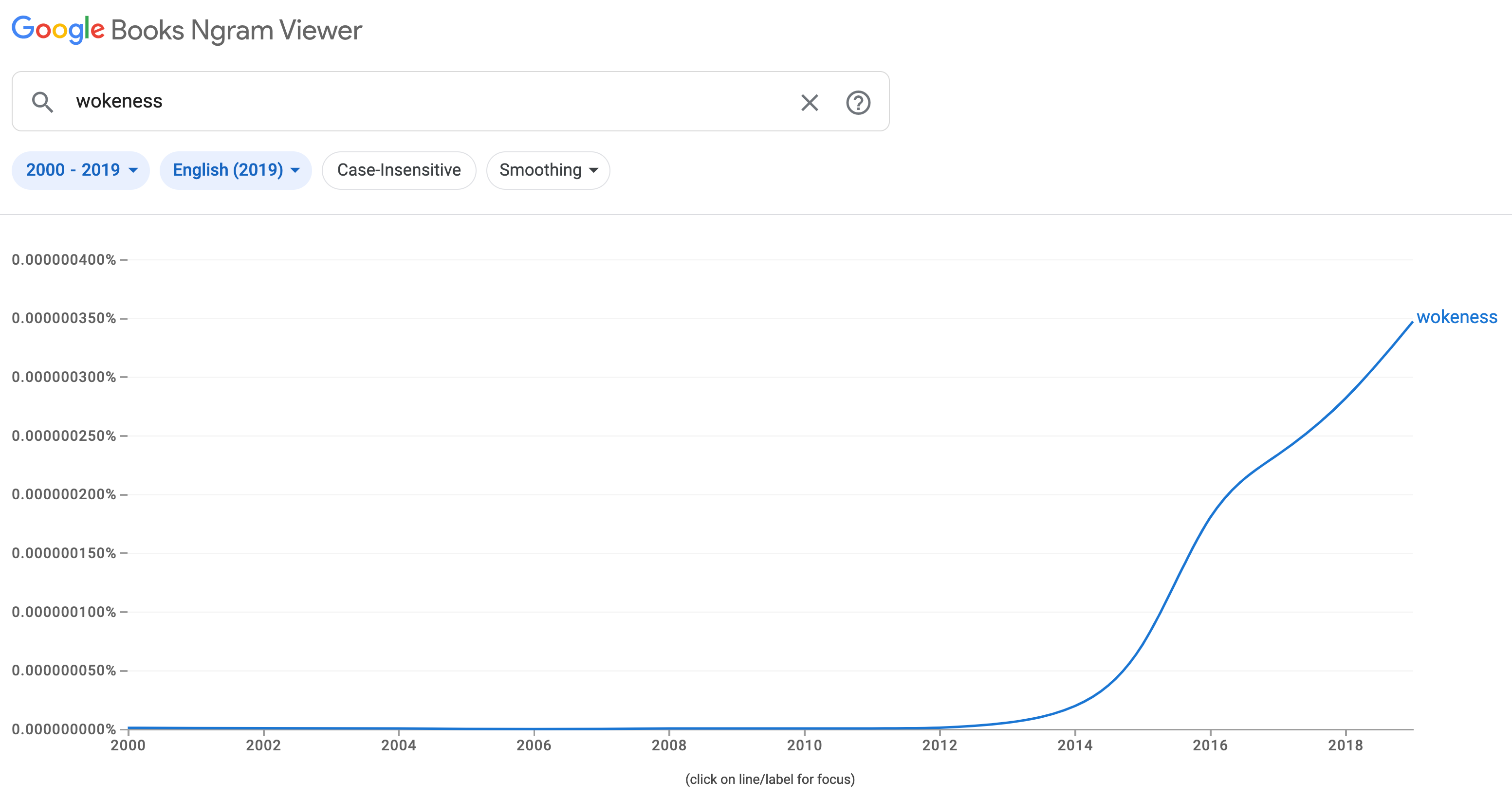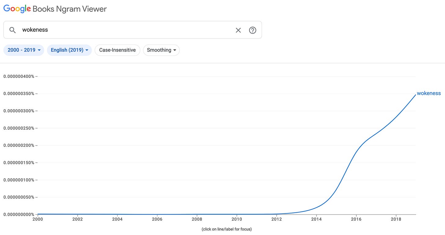 Not only do many different woke words explode starting around 2012 but the concept of wokeness itself emerges around this time, as can be seen by counting uses of the term in books: